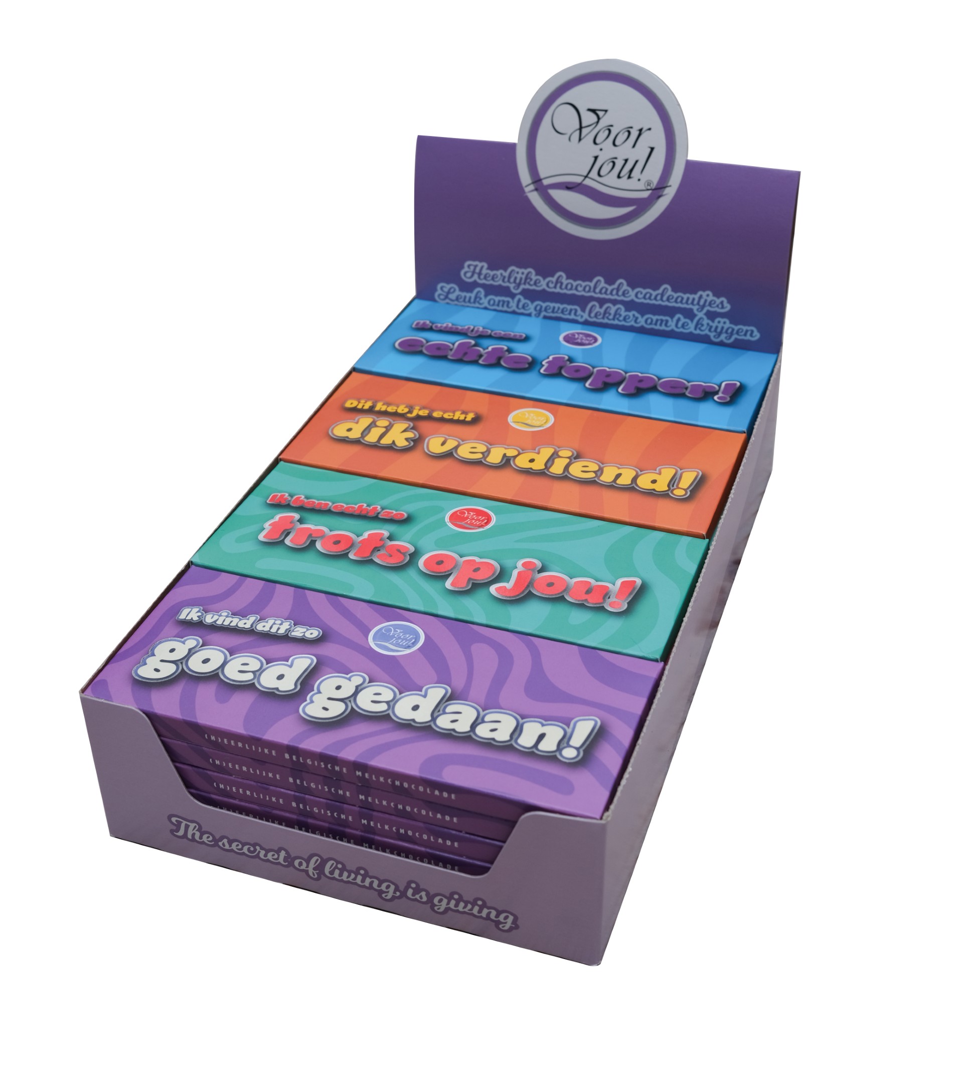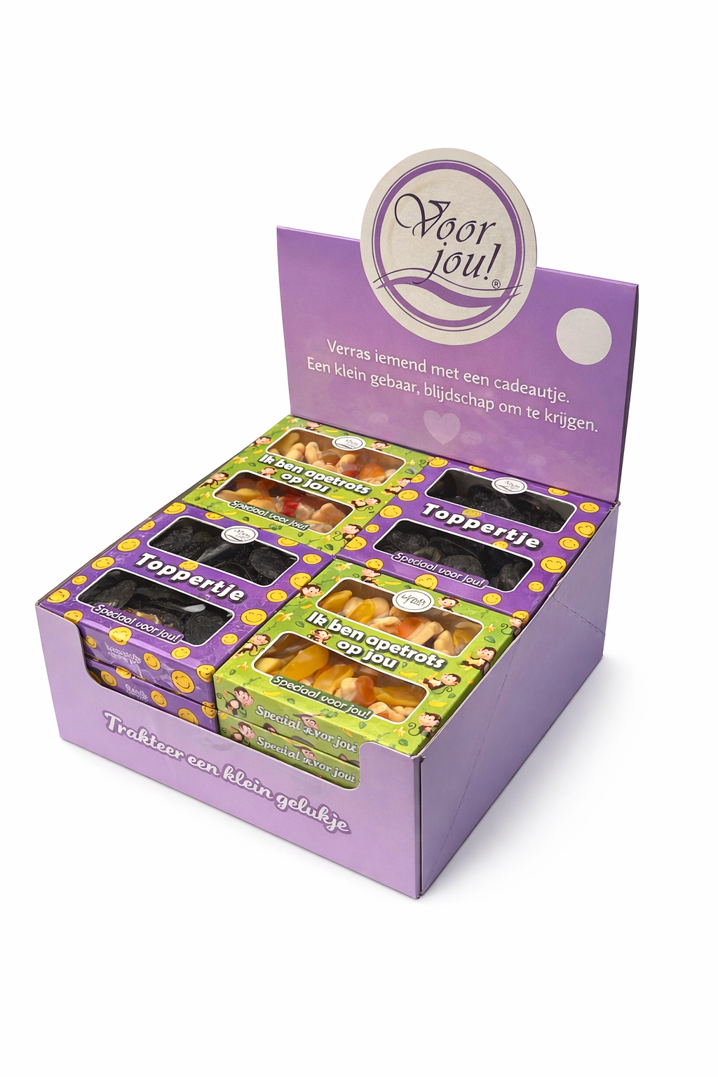 Voor jou! Snoep display avondvierdaagse. Deze display bevat 2×4 snoepdoosjes Ik ben apetrots op je en 2×4 snoepdoosjes Toppertje.